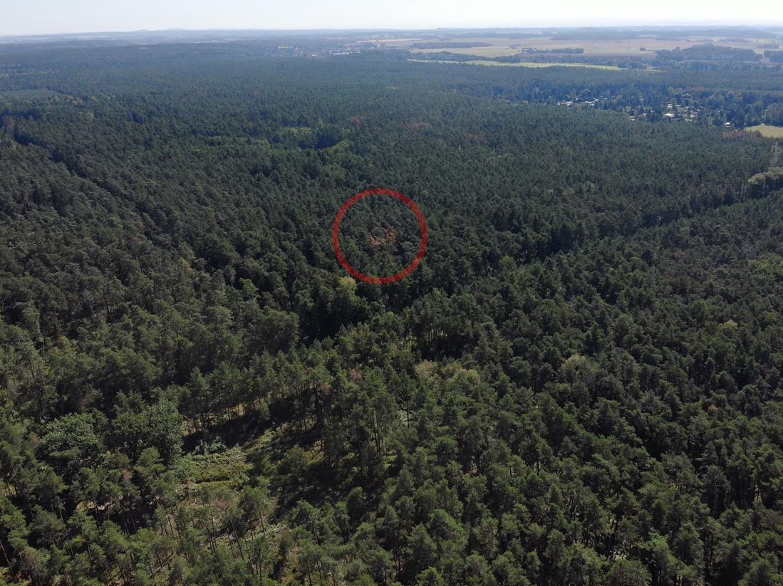 Unser Verfahren spart den hohen Zeitaufwand eines flächigen terrestrischen Begangs. Stattdessen ermöglicht ein punktueller Drohnenaufstieg auf 120 Metern Höhe einen schnellen Überblick über große Areale. Dabei identifiziert man manuell – mit dem Blick von oben – auffällige Baumkronen, etwa durch Verfärbung oder Nadelverlust. Nur diese Bäume werden im Anschluss gezielt aufgesucht.